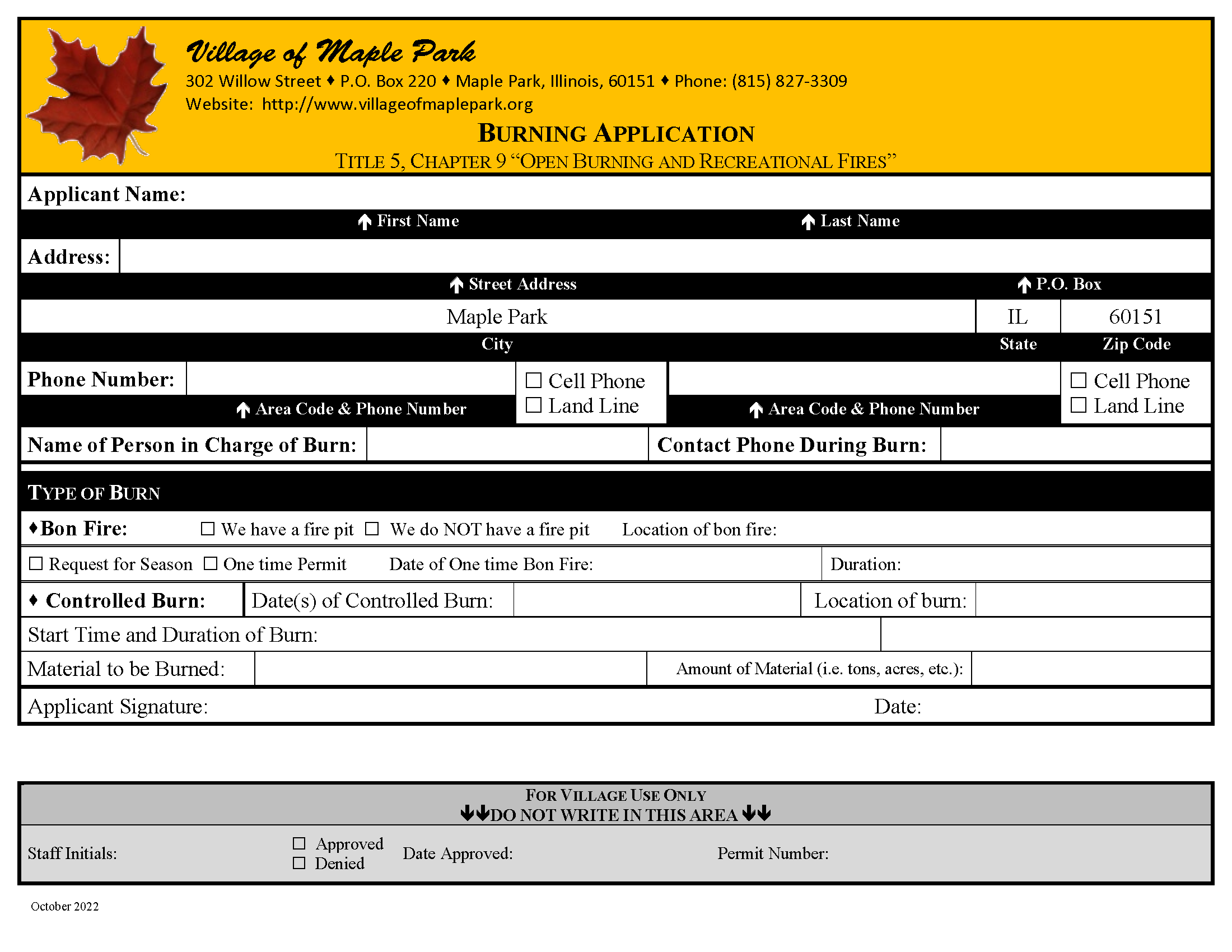 Did you know that the Village requires a burn permit in Village limits? This is a free permit that is very simple to acquire. Please see the below flyer for details and fill out the application to drop off at the Village Office. Please contact the Village Office with any questions at (815) 827-3309.